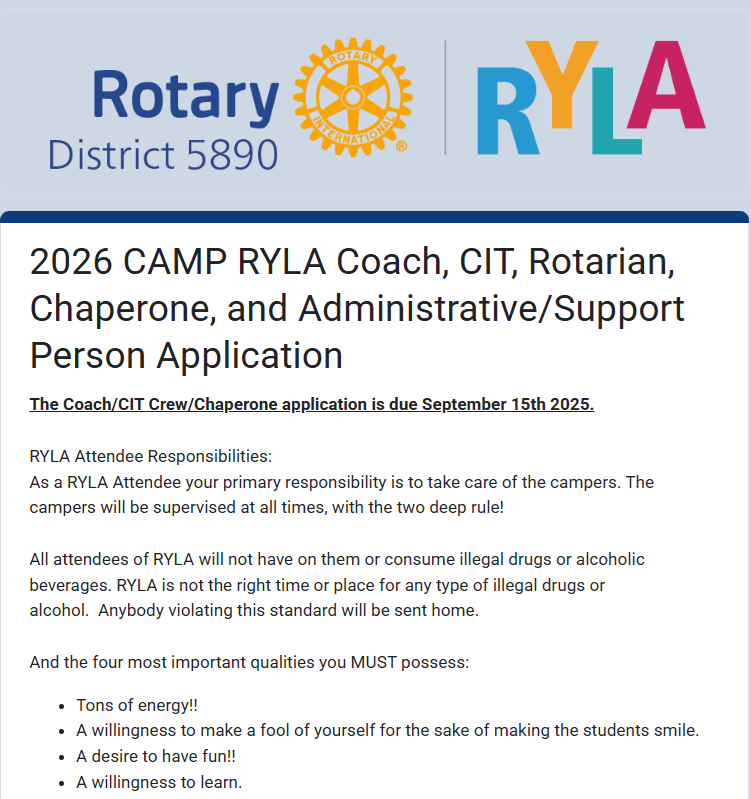 WANT TO VOLUNTEER AS A RYLA COACH, CIT, ROTARIAN, CHAPERONE OR ADMINISTRATIVE SUPPORT PERSON AT OUR 2026 CAMP RYLA?