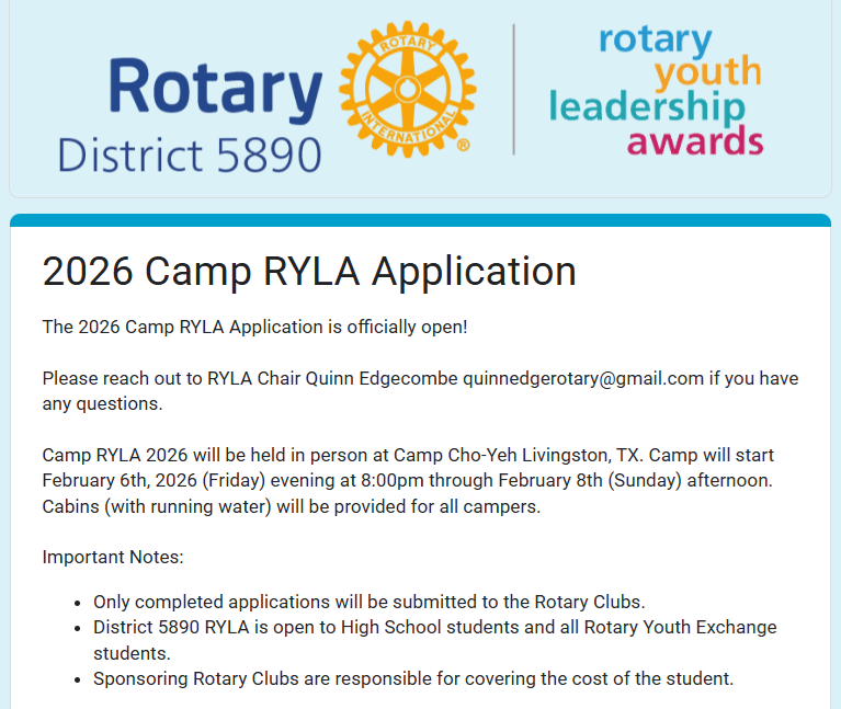 I know that I can speak for the many coaches who are excited to see you in person this year. This year, RYLA will be held this year at Camp Cho-Yeh located in Livingston, Texas.