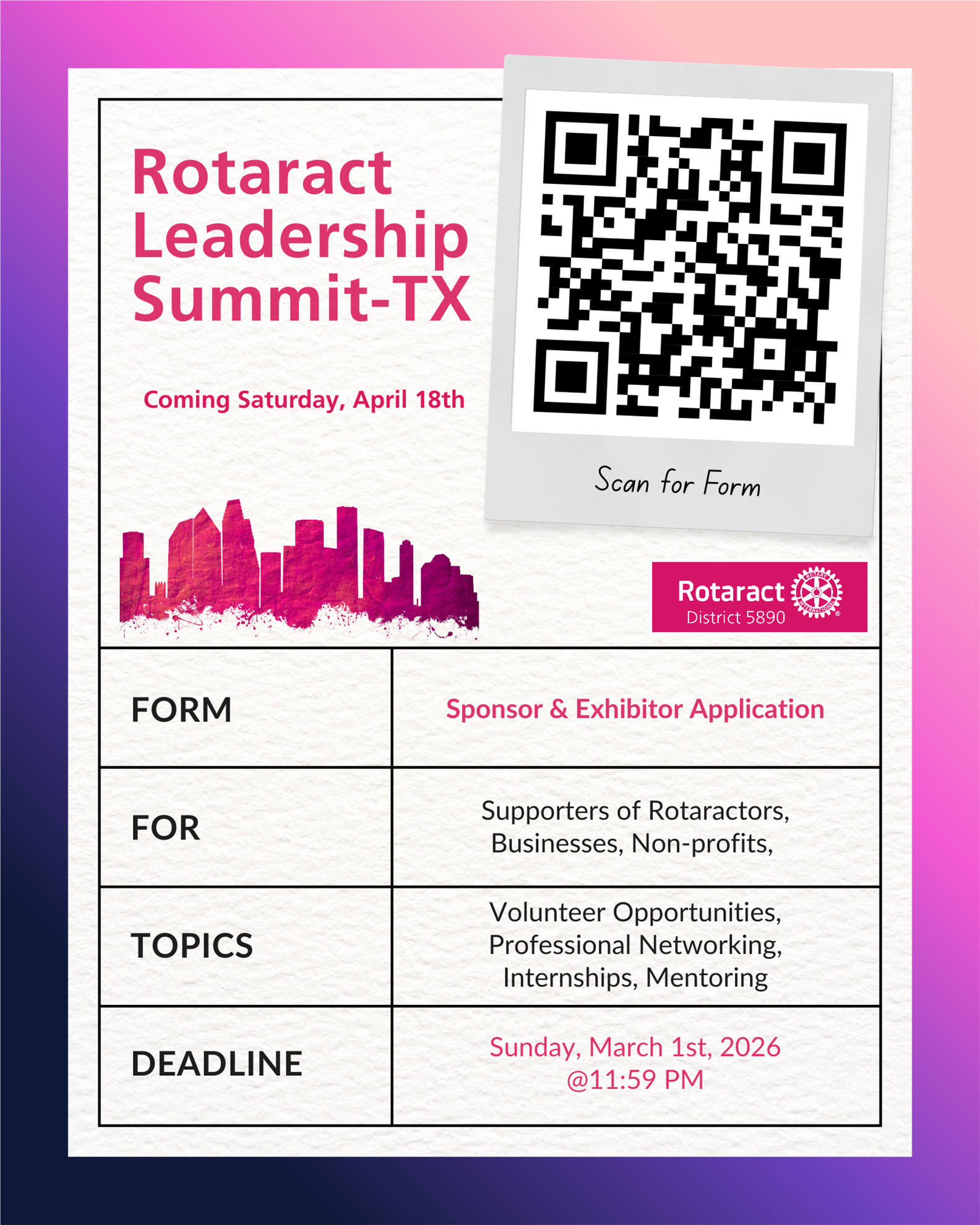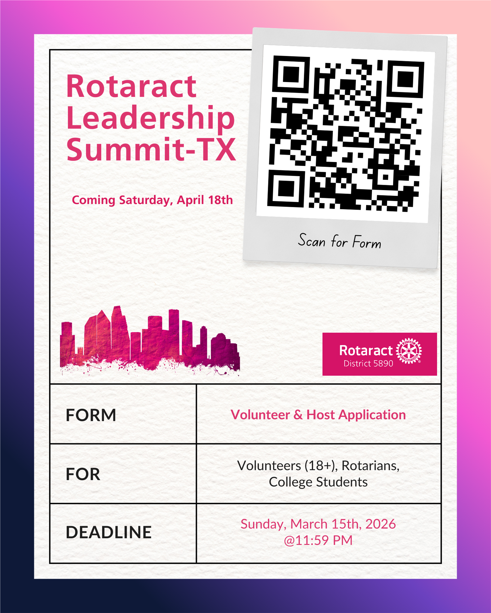 The Rotaract Leadership Summit – Texas is a leadership experience designed to ignite the future of young leaders across Texas. Rotaract members, Rotary partners, students, and young professionals will come together for a weekend of leadership development, networking, service, and collaboration.