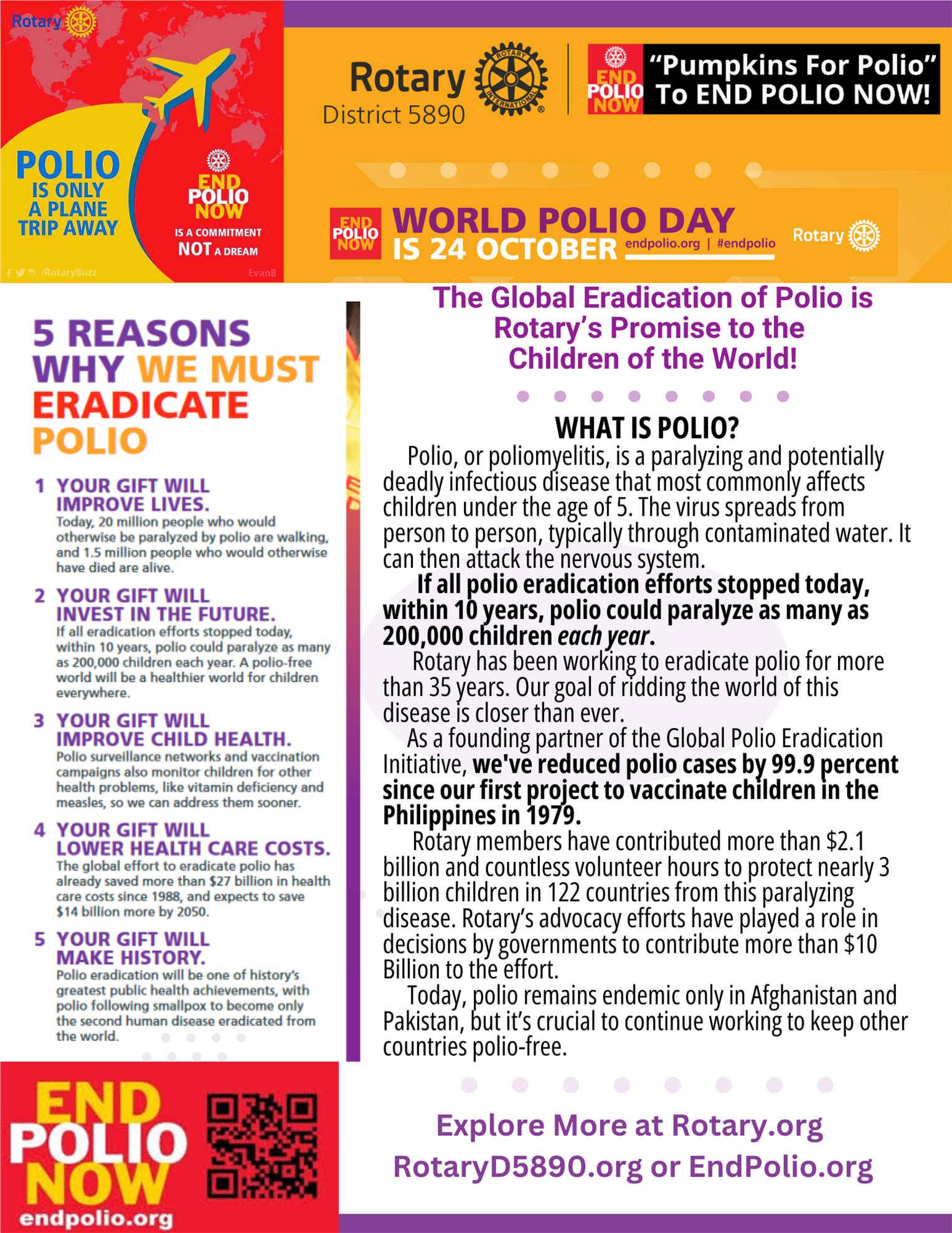 CLICK HERE to visit Rotary's World Polio Day Resource Center with ideas and material to plan and promote your club event. There are videos, materials, banners & posters, Infographics, event materials, press releases, Instagram and Facebook materials, and more!