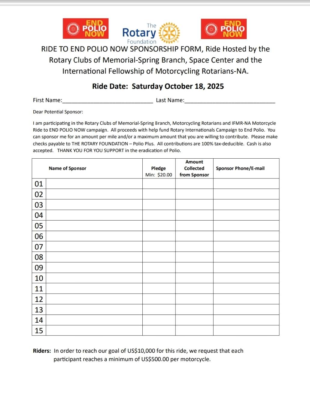 - 2025 "Motorcycle Ride to End Polio Now" - Saturday, October 18th - See story below