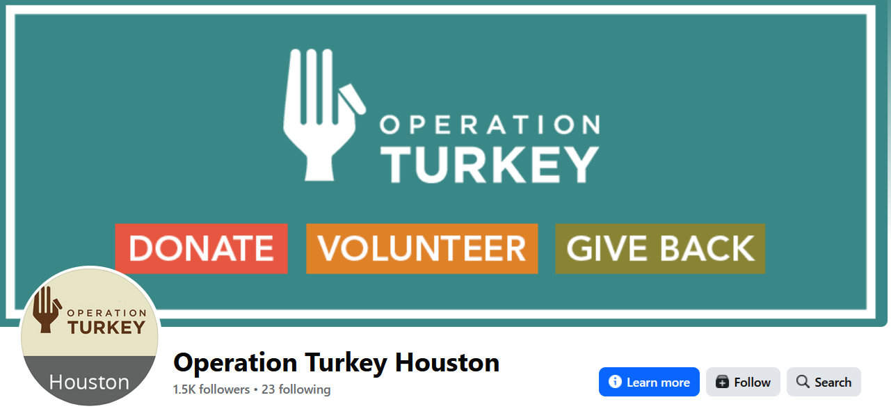 Click here for the info for the four Houston Turkey locations, volunteer times, and contact information.